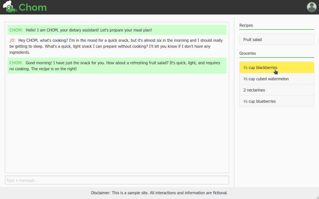 Chom interacts with users in a chat window to plan meals, make substitutions, gather recipes and prepare shopping lists. The site/app that hosts Chom is integrated with the AI to intelligently track the activities in the conversation, like listing groceries on the side and allowing for a user to export a PDF, print the list, or even order from an online retailer like Walmart for pickup or delivery.