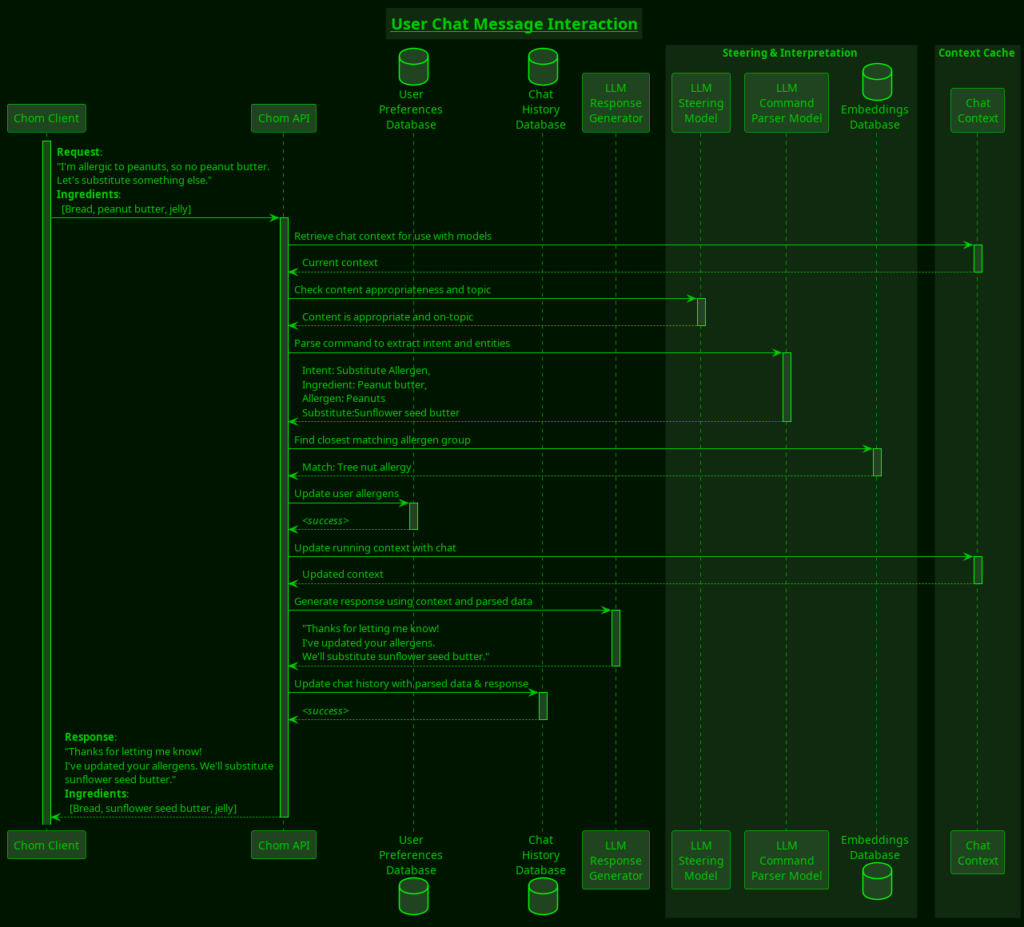 Chom runs requests through multiple AI models (known as LLMs) to perform a handful of different natural language processing tasks, before preparing a response based on a database of recipes, ingredients, and allergens.