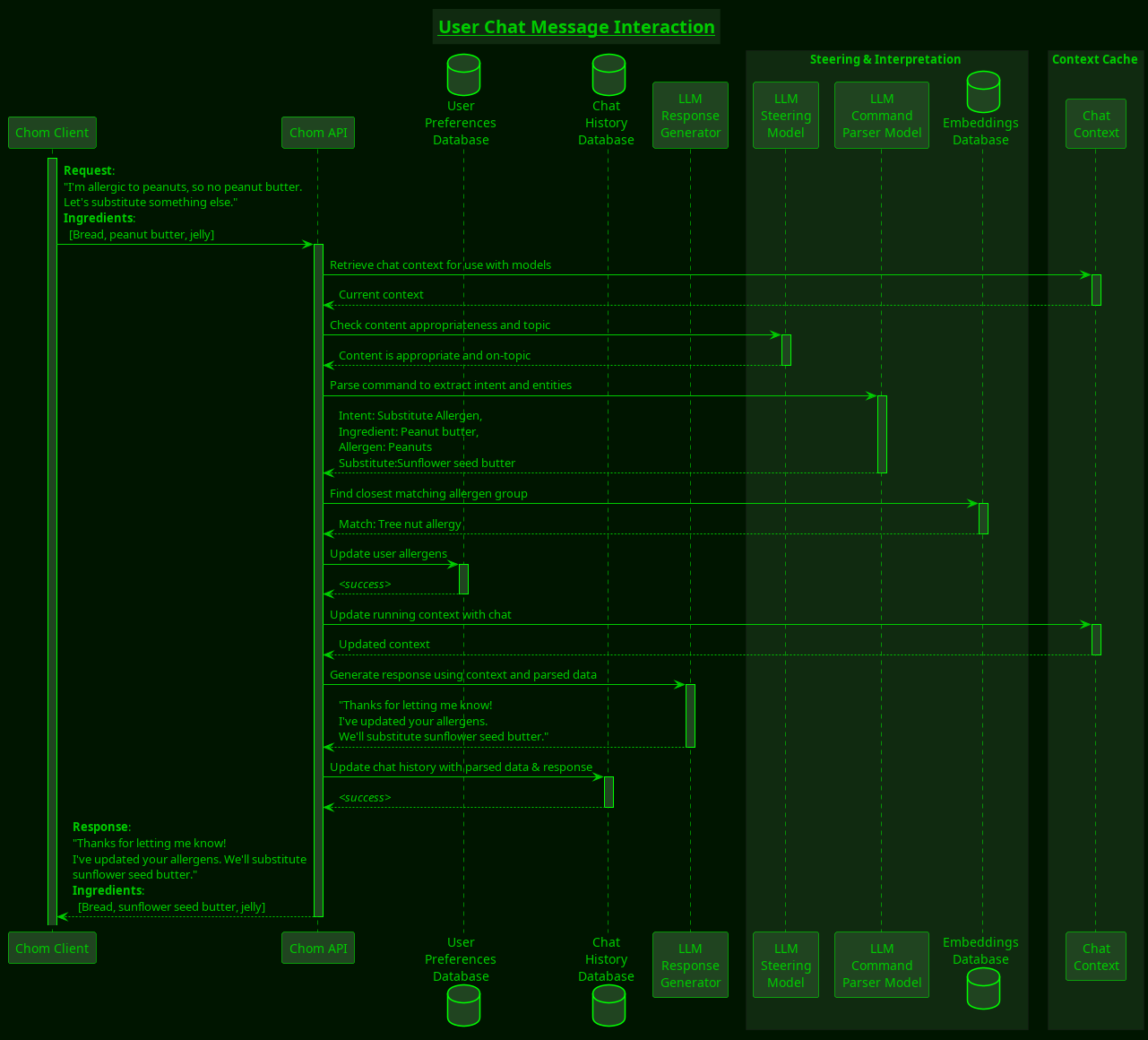 How do we get from a user’s message to an informed response from Chom? I’ve been chewing on this one for a while and I think I have an idea for a first draft. So let’s go ahead and just hit you with the sequence diagram right away: