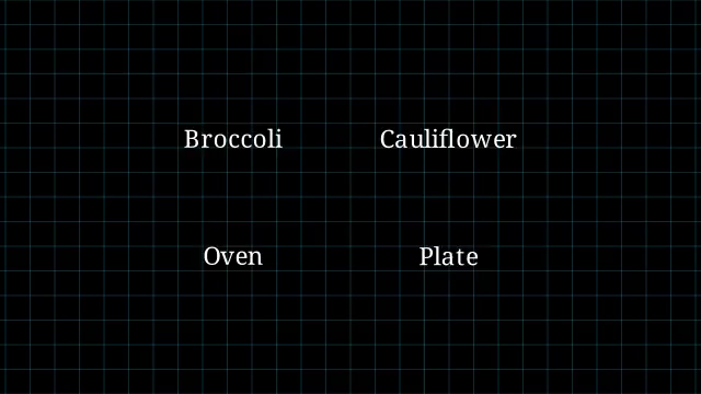 We’ll start with a very simple example. Four words: Broccoli, Cauliflower, Oven, and Plate. You probably already have a mental feeling for how these relate to each other. That feeling is what we’re exploring and codifying.