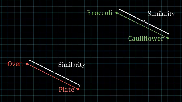 In addition, in our 2D example, notice that Broccoli and Baked Broccoli are both still about the same distance from Plate as a side effect. They both go on plates when served as a meal, after all. Yet again, our ruler is doing its job! It is these kinds of discoveries through distance groupings that let us make use of embeddings to find semantic similarity, even for words we didn’t have in our initial training data.
