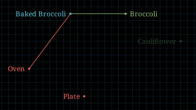 From here, let’s try to visualize what that relationship might look like. We’ll move the words to different parts of the graph, using a dots to give each an exact location. We’ll group broccoli and cauliflower together as both being delicious vegetables, while we’ll group oven and plate together as being implements in the kitchen. The distance between our dots, then, becomes how similar these words/ideas are to each other – our ruler in action.